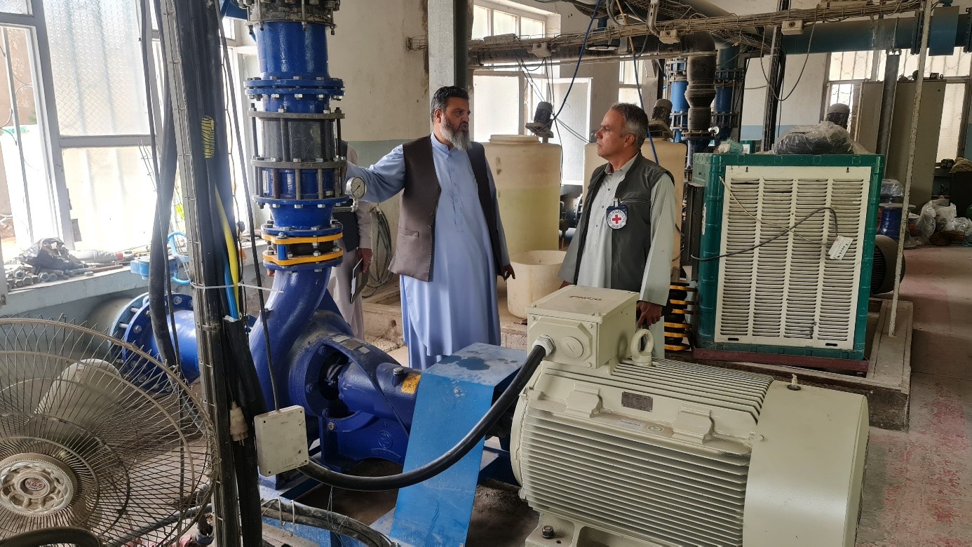 یکی از کارمندان آی سی آر سی همراه با نماینده شرکت آبرسانی شهری هرات در حال بررسی پمپهای تقویتی تازه نصبشده. (عکس: آی سی آر سی / دواجان رحیمی)