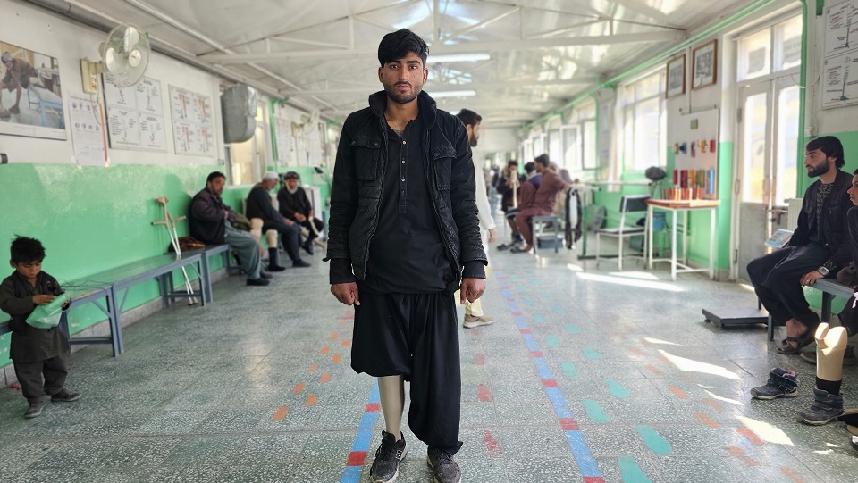 ۲۲ کلن صالح محمد، چې د کابل د ۱۲مې ناحیې اوسېدونکی او د دی، د آی سی آر سي د فزیکي بیا رغونې مرکز ته د درملنې لپاره راغلی دی. (انځور: محمد مسعود صمیمي)