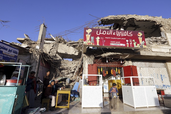Sanaa. Un jeune homme dans le magasin d'alimentation qu'il a installé au milieu d'un bâtiment détruit. Sana'a. A young man in his food store, located in a destroyed building. Galerie photos sur le site web du CICR, 13.02.2018: "Ce jeune homme a choisi le nom "cafétéria l'espoir" pour son magasin situé dans un bâtiment détruit [...]" ICRC website photo gallery, 13.02.2018: "This young Yemeni man chose the name “The Hope Cafeteria” for his shop which is located in a destroyed building [...]."