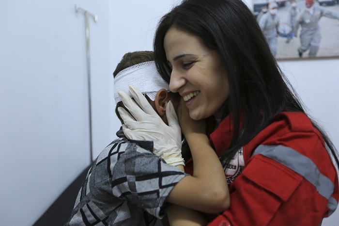 Damas-Campagne, Mouadhamidiya, Damas-Campagne. Une volontaire du Croissant-Rouge Arabe syrien réconforte un garçon après avoir pansé ses blessures. Rural Damascus, Mu'adhamiya. A Syrian Arab Red Crescent volunteer holds a boy after treating his injures.