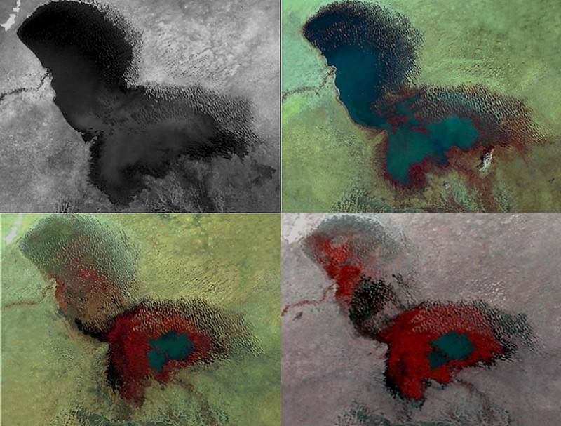 DCA01 - 20010302 - WASHINGTON, DC, UNITED STATES : In this montage of images taken 02 March, 2001 from the NASA Internet site shows Lake Chad, shown in the years clockwise from upper-L 1963, 1973, 1987 and 1997. Lake Chad, once one of the African continent's largest bodies of fresh water, has dramatically decreased in size due to climate change and human demand for water. Once a great lake close in surface area to North America's Lake Erie, Lake Chad is now a ghost of its former self. According to a study by University of Wisconsin- Madison researchers, working with NASA's Earth Observing System program, the lake is now 1/20th of the size it was 35 years ago. Found at the intersection of four different countries in West Africa (Chad, Niger, Nigeria and Cameroon,) Lake Chad has been the source of water for massive irrigation projects. In addition, the region has suffered from an increasingly dry climate, experiencing a significant decline in rainfall since the early 1960's. The first image , taken with the Argon satellite in October 1963, and three subsequent Landsat satellite images taken in January 1973, January 1987, and January 1997, show the progression of the lake as it shrinks. The red color represents vegetation on the lake bed where there was once water. EPA PHOTO NASA/NASA/kb/fm
