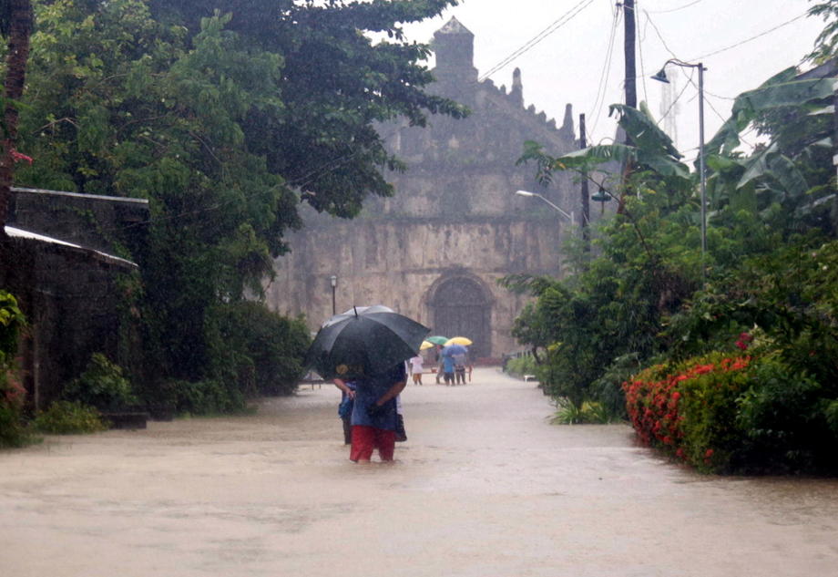epa07808992 People navigate a flooded road in Paoay, Ilocos Norte province, Philippines, 31 August 2019 (issued on 01 September 2019). The Ilocos Norte Provincial Disaster Risk Reduction and Management Council (PRRDMC) has warned villagers to follow precautionary measures due to a low-pressure area affecting the entire Luzon island. EPA-EFE/BERNIE SIPIN DELA CRUZ
