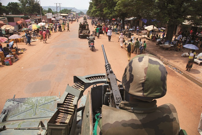 Bangui. Des soldats de la République Démocratique du Congo d'une patrouille de la Force Multinationale des États d'Afrique Centrale - force de "stabilisation" (FOMAC). Bangui. Soldiers of the Democratic Republic of Congo patrol the Multinational Force of Central African States - "stabilization" force (FOMAC).