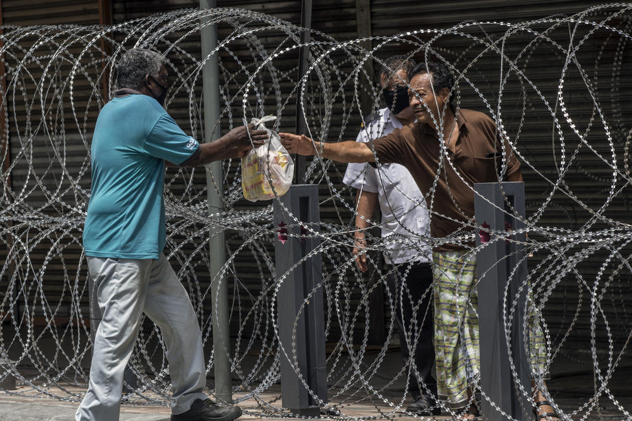 epa08347486 A man passes food to the resident behind barb wire in Kuala Lumpur, Malaysia, 07 April 2020. The area is on lockdown in order to curb the spread of coronavirus and the disease Covid-19. EPA-EFE/AHMAD YUSNI