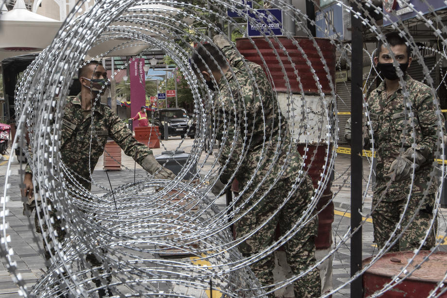 Coronavirus lockdown in Malaysia epa08347479 Malaysian army members place a barb wire fence at the entrance of a lockdown area in Kuala Lumpur, Malaysia, 07 April 2020. The area is on lockdown in order to curb the spread of coronavirus and the disease Covid-19. EPA-EFE/AHMAD YUSNI Share this article