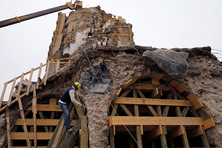A laborer works on the al-Hadba minaret during the re-construction of the Grand al-Nuri mosque, in the old city of Mosul, Iraq January 23, 2020. Picture taken January 23, 2020. REUTERS/Abdullah Rashid