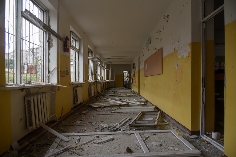 A school building is seen damaged by recent shelling during a military conflict over the breakaway region of Nagorno-Karabakh in Stepanakert October 5, 2020. David Ghahramanyan/NKR InfoCenter/PAN Photo/Handout via REUTERS ATTENTION EDITORS - THIS IMAGE HAS BEEN SUPPLIED BY A THIRD PARTY. MANDATORY CREDIT.