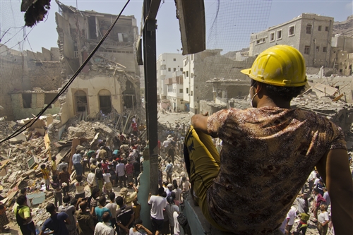Aden, Kreiter. Un sauveteur volontaire civil s’interrompt un instant, après avoir sorti des personnes blessées et des corps sans vie restés sous les décombres. Aden, Kreiter. A civil rescue service volunteer takes a break from pulling out trapped people and dead bodies from beneath the rubble.