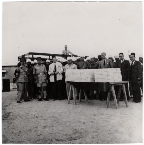 Guerre 1939-1945. Camp de prisonniers de guerre libyens. Remise de cadeaux aux détenus par les autorités égyptiennes et britanniques en présence du Dr. Desceoudres délégué du CICR. Au premier jour du congé du Bairam, chaque prisonnier de guerre musulman en Egypte reçut des dons de la part des autorités égyptiennes et britanniques. Les Egyptiens donnèrent à chaque homme un colis contenant des gâteaux pour le Bairam, des cigarettes et une carte de voeux. Les Britanniques offrirent un repas constitué du populaire ragôut de mouton et de rations supplémentaires de sucre, pâtes, oeufs, thé, onions et biscuits. Les cadeaux préparés par le Comité des Dames de l'organisation du Croissant-Rouge furent distribués par le Dr Mansour Fehay Boy, Secrétaire général de la Croix-Rouge égyptiennes, accompagné du Dr Descoeudres, délégué du CICR. Le soir, un divertissement fut offert par la section publicitaire de l'ambassade britannique, qui projeta le film "Haj" (une histoire du pélerinage à la Mecque pendant la guerre), un film d'actualités, des courts-métrages arabes de divertissement produits en Egypte et un dessin-animé de Popeye.
