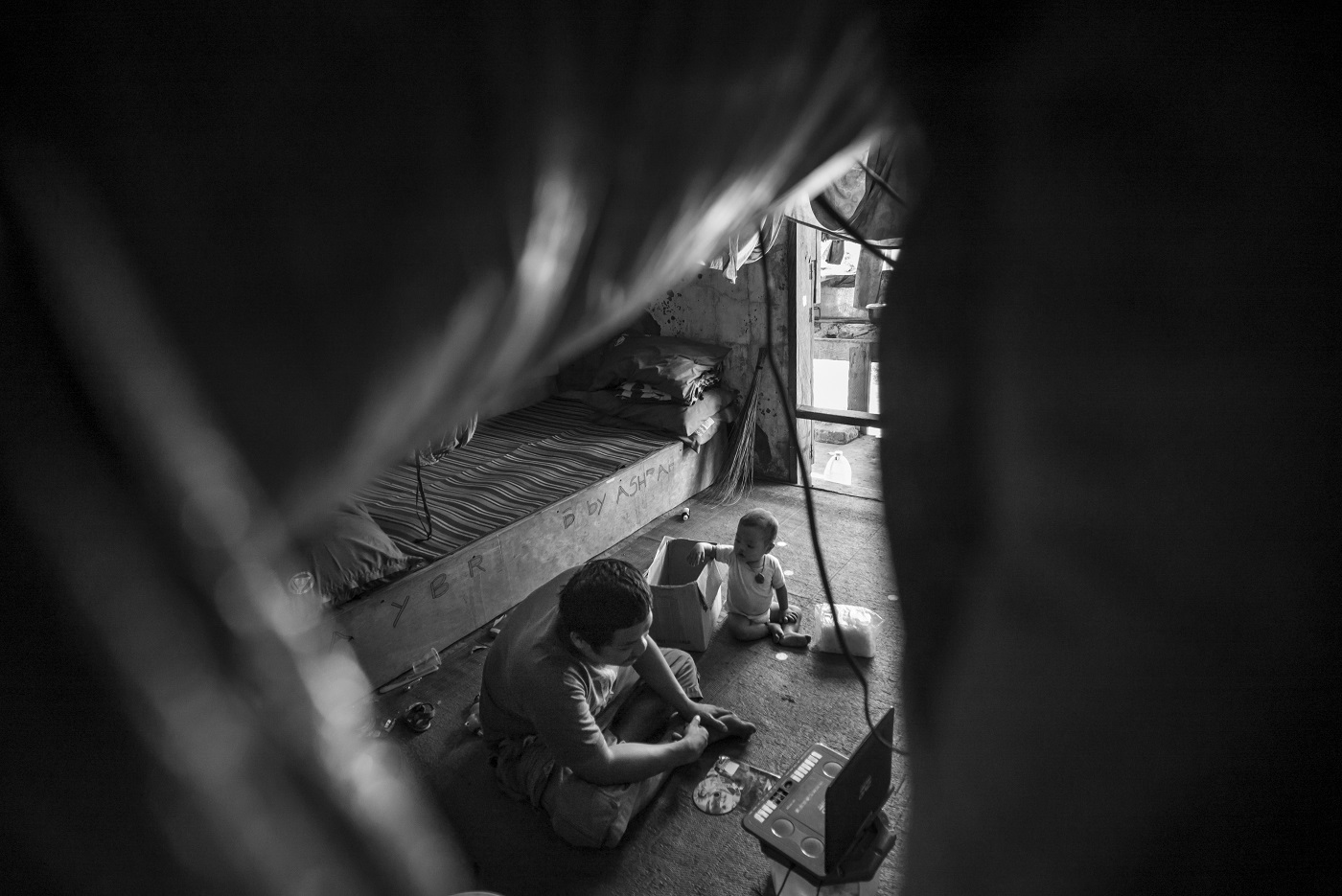 Lanao del Sur, centre d’évacuation de Saguiaran. Cet homme vit dans le centre d’évacuation avec sa famille depuis presque un an. Sa femme l’a récemment quitté, le laissant avec sa petite fille. Sans autre soutien, il consacre tout son temps à prendre soin de son enfant. Lanao del Sur, Saguiaran evacuation centre. This man has been living with his family at the evacuation centre for almost a year. His wife had recently left him and his young daughter. With no one else to turn to, he takes care of his child full time. On 23 May 2017, armed clashes broke out in Marawi City in Lanao del Sur province, southern Philippines. What many residents thought were brief clashes between government troops and IS Ranao fighters turned out to be a highly destructive urban conflict that lasted five months. More than 300,000 people fled their homes and lived in displacement during this period. While some families have started rebuilding their lives, an estimated 230,000 people remain displaced to date – including residents of the main affected area. Many were separated from their families and are still looking for their loved ones who went missing.