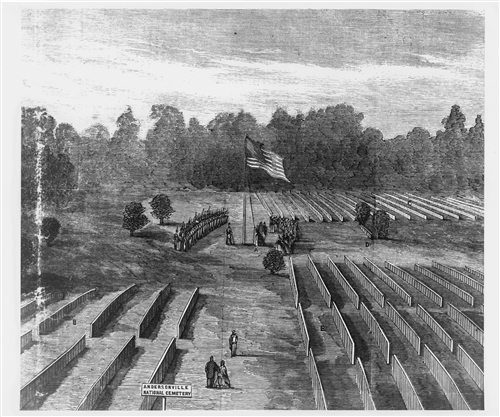 Andersonville/Georgia, cimetière militaire. Clara Barton (1821-1912), future fondatrice de la Croix-Rouge américaine, hissant le drapeau. Cet endroit est tristement connu pour sa prison de la Guerre civile américaine. Barton and two soldiers, one of them a former prisoner of war, were given authority by President Lincoln to search for missing men. (Woodcut from Harper's Weekly, October 7, 1865) Born in North Oxford, Massachusetts, on December 25th 1821, Barton rose from small farm background to become a schoolteacher, government worker, Civil War nurse, women's prison superintendent and dedicated humanitarian.