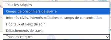 Afin de représenter les camps et de faciliter la navigation sur la carte, les camps sont classés en quatre catégories sur la carte : camps de prisonniers de guerre, détachements de travail, camp d’internement civil et hôpitaux. En utilisant l’option des calques en bas à droite du site, il est possible de visualiser chaque catégorie indépendamment les unes des autres.