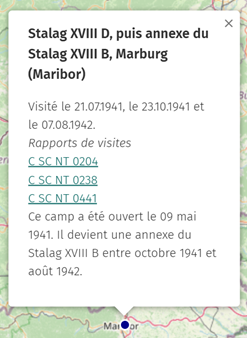 Pour ce qui est des notices présentant chaque camp, celles-ci ont systématiquement la même structure. Le titre de chaque notice présente le nom du camp, ainsi que le nom de la ville dans lequel il se trouvait. Le nom du camp est celui indiqué dans les rapports et dépend donc des informations que le délégué avait en sa possession. Lorsque le nom du camp a changé au cours de la guerre, ce qui est plutôt courant, cette évolution est indiquée par le terme “, puis” (par exemple : “Oflag XVIII B, puis Stalag XVIII A”). Dans le cas où le nom de la ville a changé, il a été choisi d’indiquer en priorité le nom se trouvant dans les archives, tout en le complétant entre parenthèses par le nom contemporain de la ville. Ainsi, la recherche est simplifiée pour toute personne qui ne serait pas spécialiste du sujet et qui ne connaît donc pas nécessairement l’ancien nom du lieu recherché.
