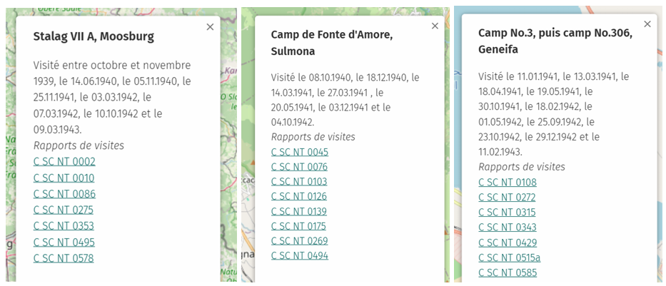 En se basant sur les dossiers du CICR, cette carte donne aussi une vision d’une partie des activités réalisées par l’institution durant cette période. L’ajout d’un lien vers les archives concernant chaque camp permet aussi de faciliter l’accès et la navigation dans ce large corpus d’archives composé de plus de 1000 dossiers. De cette manière, un visiteur des archives du CICR cherchant un camp précis peut accélérer sa recherche en faisant une première recherche en passant par la carte afin d’accéder aux dossiers auxquels il souhaiterait avoir accès, avant de compléter celle-ci par une recherche dans l’inventaire en ligne.