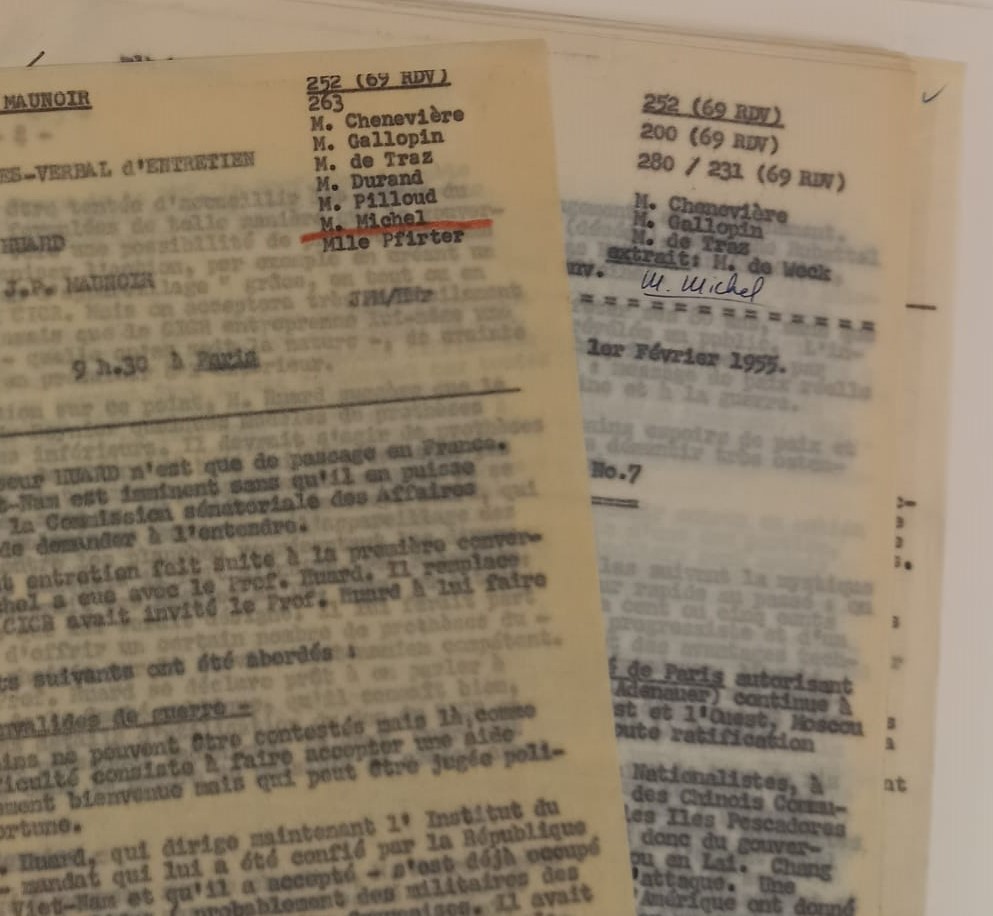 Excerpt from the working documents left by the Paris delegation, 1955. Call numbers at the top right hand corner allowed the typists to know where was the information kept in ACICR D EUR France1-0375″.