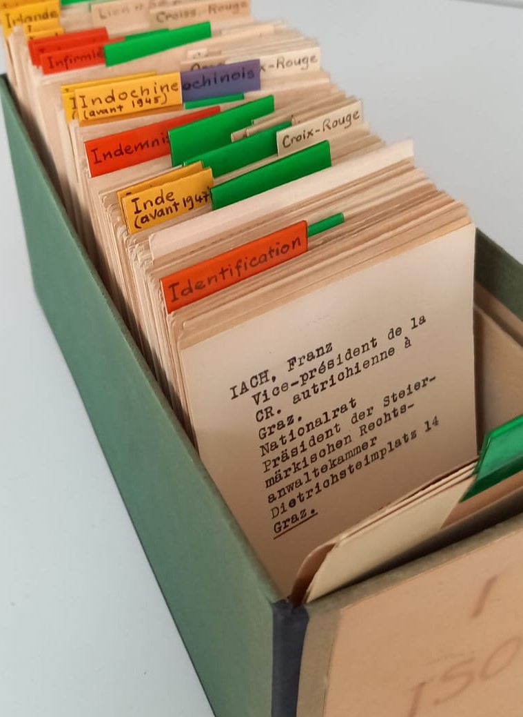 Each card is written in a standardised way: the main information received on each personality, organisation and theme is indicated in telegraphic style, before the archive reference where the relevant information can be found is added in red. To help you find way around the cards, small plastic bookmarks in different colours were added: green for the letters of the alphabet, yellow for countries and regions, blue for ethnic groups and nationalities, and red for subjects.