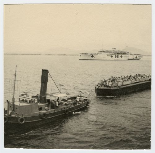 Guerre 1939-1945. Berbera. Evacuation de civils italiens. Les chalands, chargés de civils italiens, les dirigent vers les paquebots italiens. War 1939-1945. Berbera. Evacuation of Italian civilian. Barges, loaded with Italian civilians, steer them towards the Italian passenger ships.