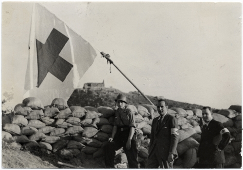Guerre civile d'Espagne 1936-1939. Valence. Reddition du sanctuaire de la "Virgen de la Cabeza". Reddition des assiégés aux troupes républicaines. (200 gardes civils et leurs familles, 800 femmes et enfants, se trouvaient isolés depuis plus de 8 mois au sanctuaire situé à 30 km du front). Pendant la trêve du 23 avril 1937, les délégués du CICR sur la ligne de front des républicains pour négocier les conditions de reddition entre les assiégés et les assiégeants du sanctuaire de la "Virgen de la Cabeza".
