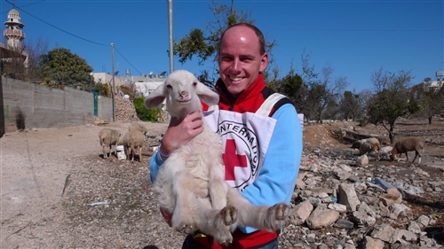 Vieille ville d'Hébron. Délégué tenant un mouton qui sera distribué à des bénéficiaires de l'aide du CICR à Tel Rumeida. Old city of Hebron. Delegate is handing a sheep that is going to be distributed by ICRC to beneficiaries in Tel Rumeida.