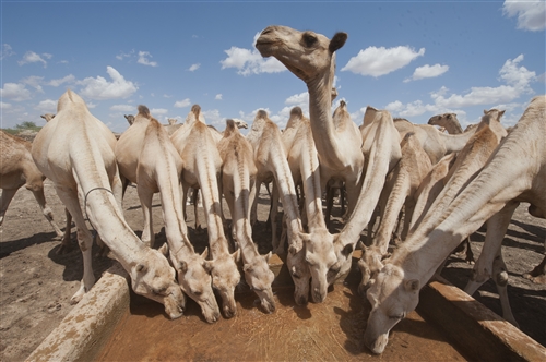 Région de Bakool, Hudur. Des chameaux s’abreuvent dans un puits. Bakool region, Hudur. Camels drinking from a well. Leur bosse permet aux chameaux de ne pas boire d’eau pendant de longues périodes. Les Somaliens se constituent généralement en sociétés pastorales et gardent les chameaux à des fins patrimoniales. La taille d’un cheptel est souvent utilisée pour mesurer la richesse dans la culture somalienne. The hump enables the camels to go for long period of time without water. Somalis are mostly pastoralists and treasure camels. The number of heads in a herd is usually a measure of wealth in Somali culture.