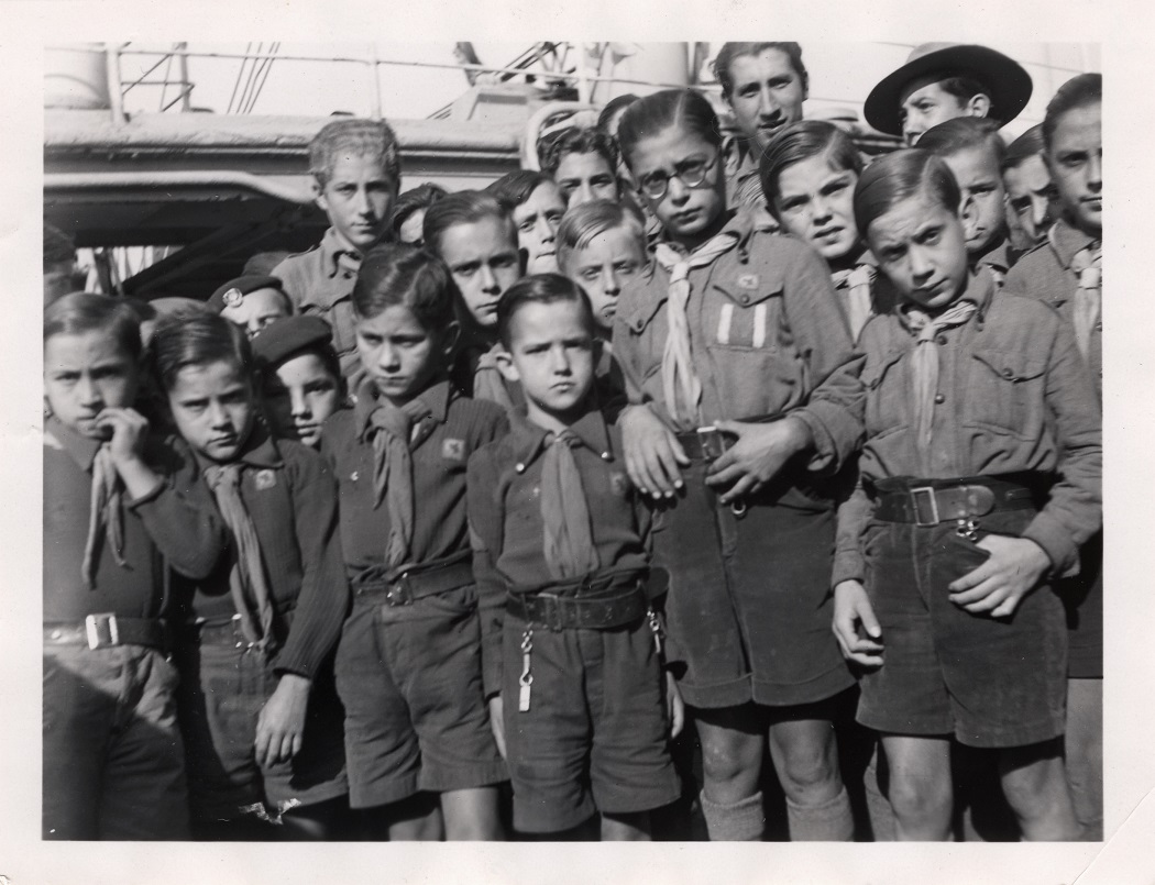 Guerre civile d'Espagne 1936-1939. Rapatriement de scouts. Scouts rapatriés sur le vapeur français "Imerethie II", arrivés le 4 juin à Marseille avant de gagner le pont international d'Irun le 7 juin pour rentrer à Saragosse. En juin 1936, 66 éclaireurs de Saragosse campaient dans la vallée d'Ordessa, à 10 km de la frontière française. A la suite des démarches du CICR, 45 d'entre eux furent autorisés à quitter Barcelone et traversèrent la frontière pour trouver refuge à Lourdes le 23.10.1936. Ils regagnèrent Saragosse le 20.04.1937. Les 21 éclaireurs restés de force à Barcelone, (jugés aptes au service militaire) furent l'objet d'un échange, préparé par le CICR, avec une troupe d'opérette, ell-même retenue à Saragosse. Les négociations aboutirent; le vapeur français Imérethie II quittait Barcelone le 3 juin pour Marseille. Le croisement des éclaireurs et des acteurs de la troupe d'opérette "Noranjas de la China" eut lieu le 7 juin sur le pont international d'Irun.