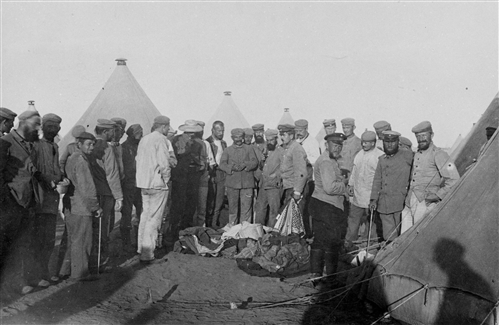 Guerre 1914-1918. Camp de Rabat-Aguedal. Visite aux prisonniers de guerre allemands par un délégué du CICR. World War I. Rabat-Aguedal camp. ICRC delegate visiting German prisoners of war. A la demande du gouvernement allemand, le CICR a envoyé 3 missions parallèles au Maroc (Dr. Blanchod et Dr. Speiser), en Tunisie (Dr. Vernet et Dr. R. de Muralt), en Algérie (M. P. Schatzmann et Dr. O.L. Cramer).