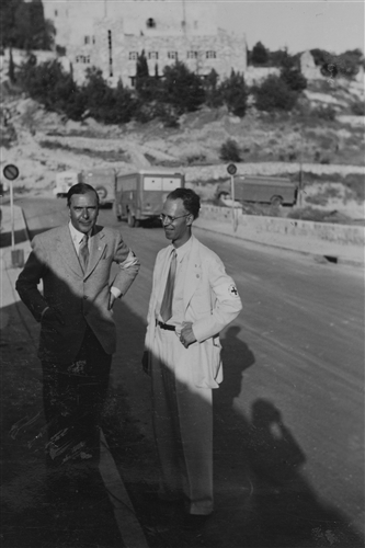 Jérusalem, no-mans land près du Mont de Sion. Le président du CICR, Paul Ruegger, et le chef de délégation, Jacques de Reynier, assistent à l'évacuation de 3000 Juifs du quartier juif de la ville. Jérusalem, no-mans land near Mont de Sion. ICRC president, Paul Ruegger, and the head of delegation, Jacques de Reynier, witness the evacuation of 3000 Jews from the Jewish area of the city.