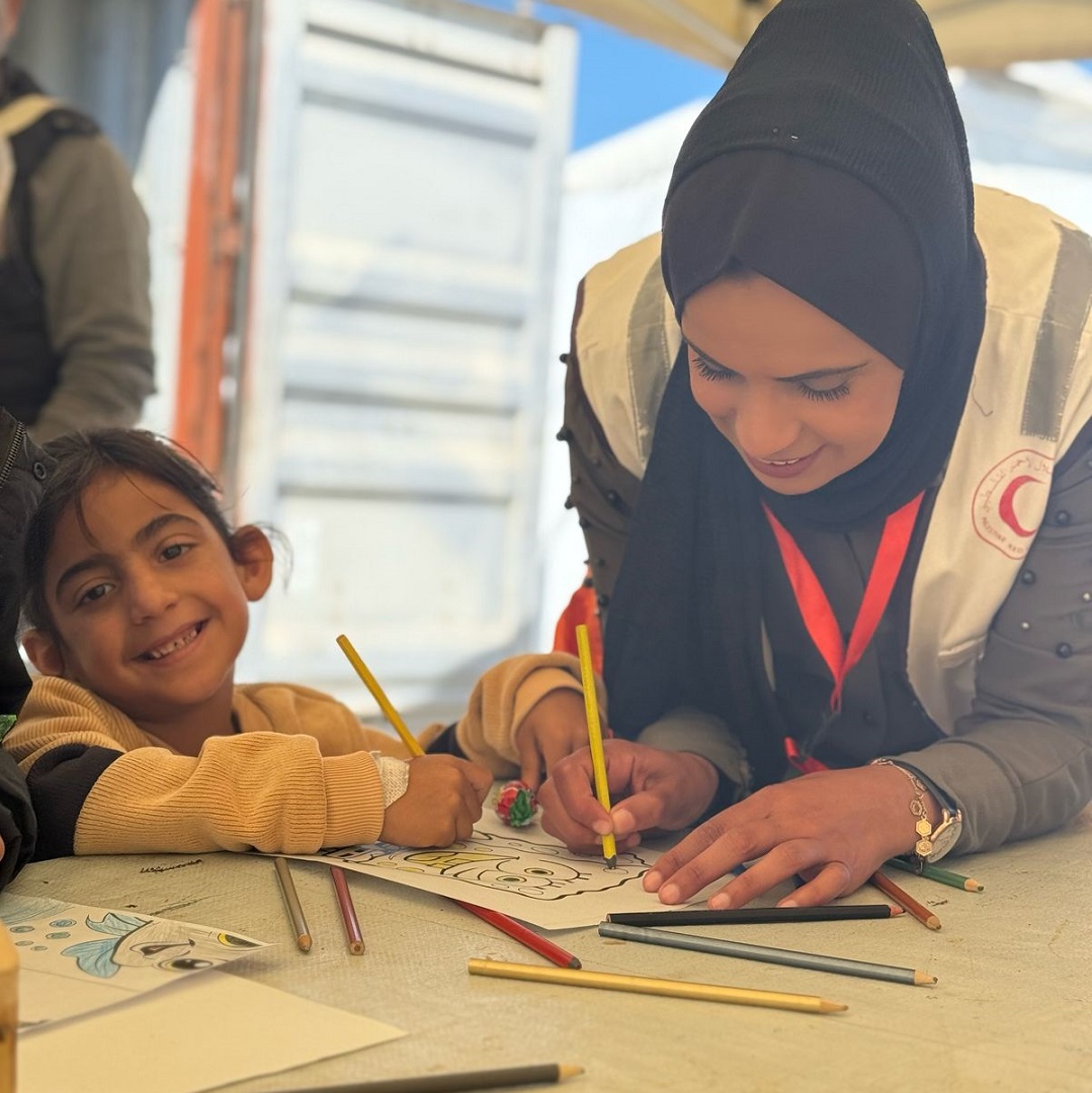 Amna Al-Akhras anime une activité avec un enfant à l’hôpital de campagne de la Croix-Rouge dans la bande de Gaza — un geste simple pour apaiser les traumatismes et redonner une place à l’enfance, même au cœur de la crise.