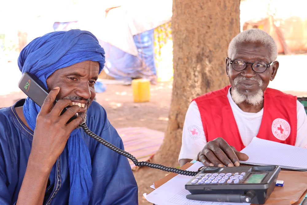 Seydou Diallo, volontaire de la Croix-Rouge malienne, aide à rétablir les liens familiaux en facilitant les appels entre proches séparés par le conflit ou la migration. Camp de déplacés de Sénou, Mali.