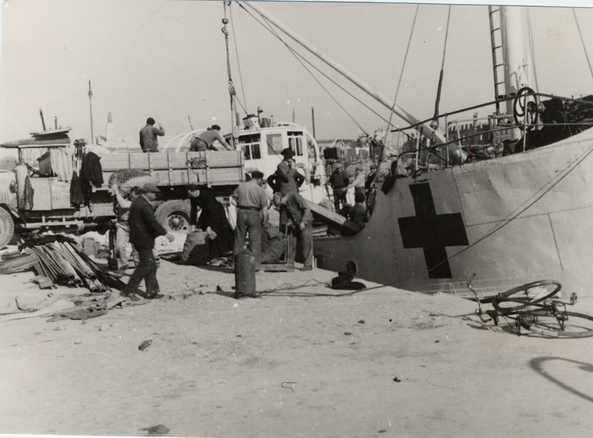 Guerre 1939-1945. Lorient. Bâteau de la Croix-Rouge française pour ravitailler la population de l’île de Groix.