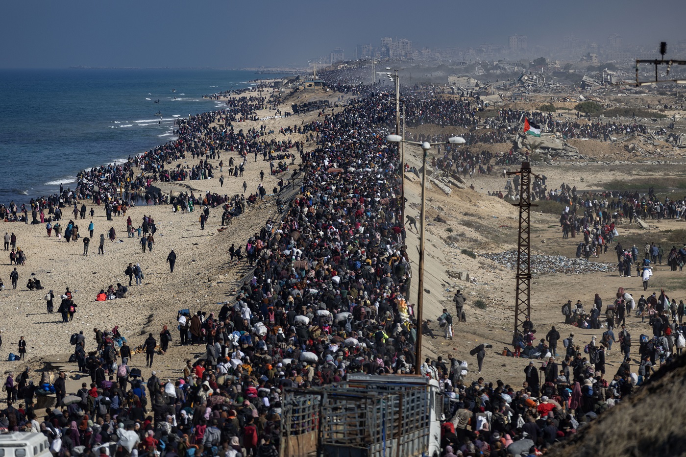 Des foules massives de Palestiniens qui avaient été déplacés vers le sud de la bande de Gaza retournent vers le nord suite à la décision d’Israël d’autoriser leur retour dans leur ville pour la première fois depuis les premières semaines de guerre contre le Hamas, dans la zone du pont Wadi Gaza à Gaza City le 19 janvier 2025. © Saher Alghorra / Zuma Press