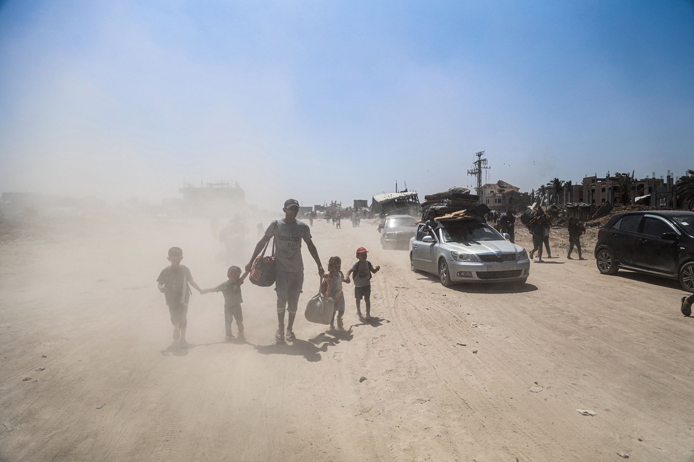Des Palestiniens fuient leurs maisons dans la partie est de Khan Younis, à Gaza, le 22 juillet 2024. Menacés d’évacuation par l’armée israélienne, ils ont été contraints de fuir sous les tirs de l’armée, dans un climat de peur et de panique parmi les citoyens, femmes et enfants. © Saher Alghorra / Zuma Press