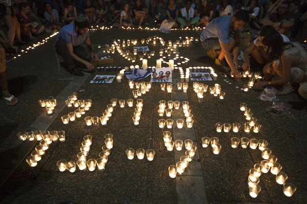 Israelis light candles in Tel Aviv's Rabin Square, as they mourn the death of three teenagers who were abducted June 30, 2014. Israeli forces found the bodies of the three missing teenagers in the occupied West Bank on Monday after a nearly three-week-long search and a sweep against the Islamist Hamas group that Israel says abducted them. The candle spells out the names of the killed teenagers in Hebrew. REUTERS/Nir Elias (ISRAEL - Tags: POLITICS CIVIL UNREST) - RTR3WIW7