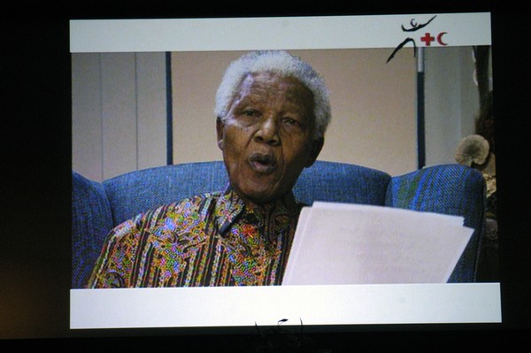 Geneva International Conference Centre. Pre-recorded address by Nelson Mandela, during the welcoming ceremony of the 28th International Conference of the Red Cross and Red Crescent.