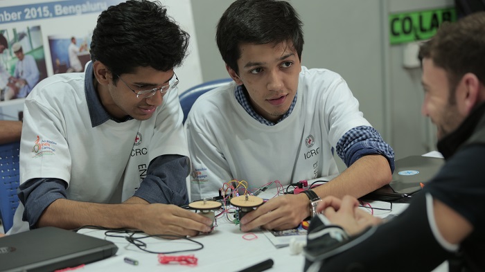 Bengaluru (Karnataka) : Enable Makeathon – Members of Team TruFocus receive inputs on their prototype from Swiss expert Dario during the Maker Days on 19-21 December 2015.