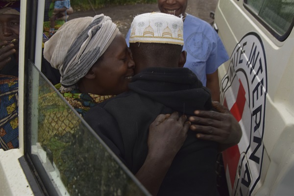 Province du Nord-Kivu, Kalengera. Programme du CICR de rétablissement du lien familial. Une femme accueille l'arrivée de son fils, qu'elle n'avait pas vu depuis quatre ans, pris en charge par le CICR. North Kivu province, Kalengera. ICRC restoring family links program. A mother greets her son, arriving in their village with an ICRC team. They haven't seen each other for four years. La mère dit: "Je ne pouvais pas attendre chez moi. Il fallait que je vienne pour le serrer dans mes bras dès son arrivée." The mother said: "I couldn't just wait home. I had to come here to hold him in my arms as soon as he arrived".