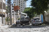 Electricity workers attempt to fix the infrastructures after it was damaged following an Israeli attack on nearby Daoud Tower during the night, Gaza city, July 18, 2014. As of 18 July, according to the Ministry of Health in Gaza 278 Palestinians have been killed and 2.200 injured since the beginning of the Israeli offensive.