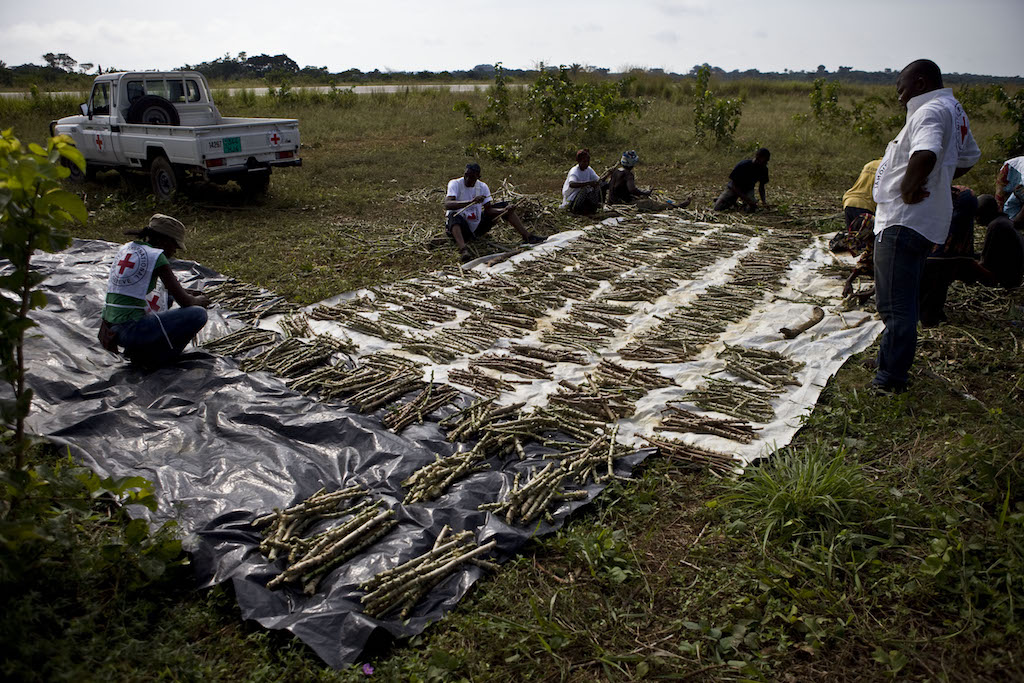 Owando. Une équipe du CICR et des volontaires de la Croix-Rouge congolaise préparent des boutures de manioc résistant au virus de la mosaïque du manioc. Elles seront distribuées aux populations locales du district de Likouala. Owando. An ICRC team with local volunteers from the Congolese Red Cross are preparing cassava cuttings tolerant to mosaic disease. They will be distributed to local populations in the Likouala district. The ICRC will distribute cassava cuttings, agricultural equipment and fishing materials to prevent depletion of food reserves. This assistance will benefit about 100,000 people in the Likouala district. With this distribution, the ICRC aims to strengthen the economic capacity of the resident population of Likouala, to avoid depletion of commodities, including cassava and fish. With the volunteers of the Congolese Red Cross, ICRC assists families in five districts of the country (Btou, Enyele, Liranga, Impfondo Dongou). In addition to fishing equipment and culture, families receive cassava cuttings tolerant to mosaic disease, caused by a virus and highly destructive. The Likouala region is very difficult to access, and distribution continues with barges, boats, and trucks. Armed violence in the Equateur province in DRC had pushed people to flee to the Likouala, on the other side of the border to find refuge in October 2009. According to government officials, nearly 115,000 people had crossed the river Oubangui.