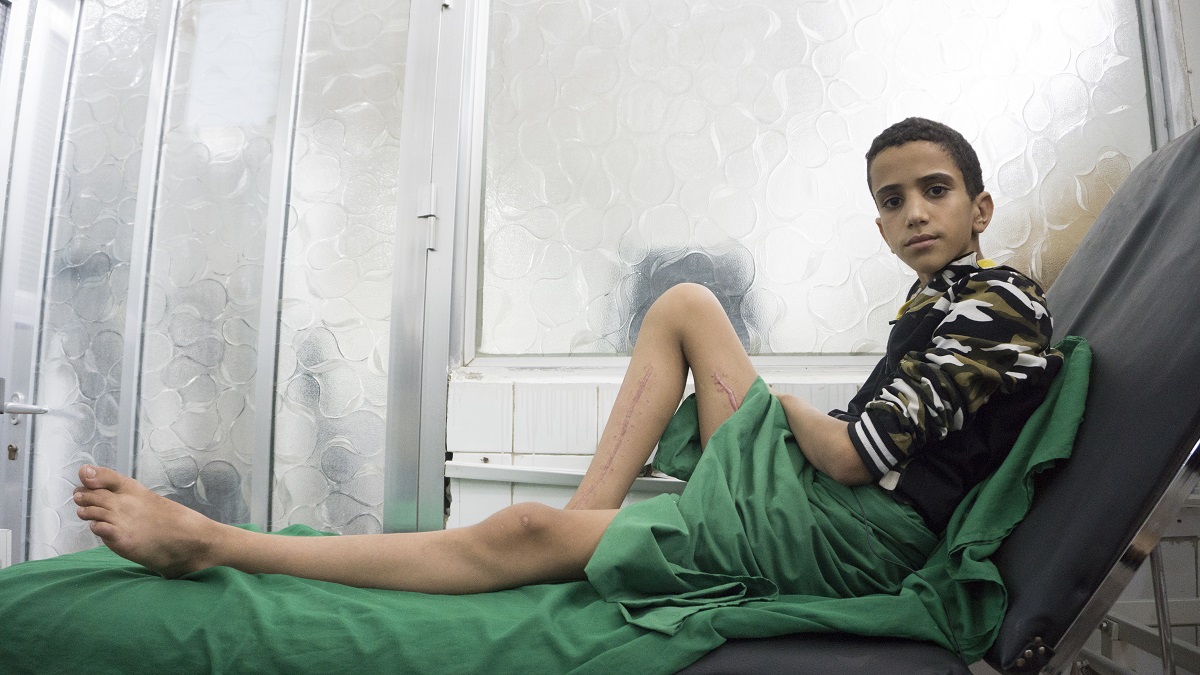 Sanaa, centre de réhabilitation physique soutenu par le CICR. Portrait d'un garcon de 14 ans qui a reçu cinq balles dans un tir croisé. Il a perdu l’usage de son pied droit mais pourra marcher à nouveau grâce au traitement qu’il reçoit au centre. Sana’a, physical rehabilitation centre supported by the ICRC. Portrait of 14 years old boy who received five bullets in a crossfire. He lost the use of his right feet but will be able to walk again with the treatment he receives at the centre. He escaped imminent death. Caught in the crossfire in his hometown, Ibb, he received five bullets: three in his right leg and two in his left. He was lucky that they rushed him to a nearby hospital for first aid, which saved his life. But, one bullet unfortunately cut through one of his nerves and as a result he is unable to move his right foot forever. He suffers from what is commonly known as “foot drop.” However, at the physical rehabilitation center, he has been receiving treatment which is enabling him to walk again.