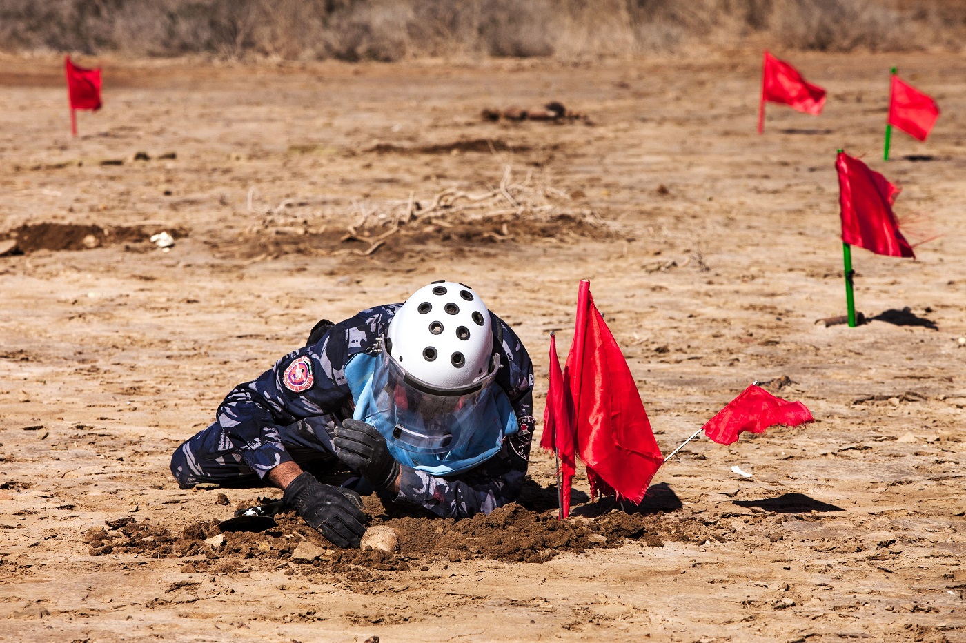 Province de Waassit, Kut. Un officier de la Défense Civile irakienne s'exerce à la procédure pour nettoyer une zone contaminée par des mines anti-personnel et des restes explosifs de guerre. Waassit Province, Kut. An Iraqi Civil Defense officer practices the clearing procedures of an area contaminated by anti-personnel landmines and explosive remnants of war. Cette zone est un ancien site de l'armée irakienne utilisé pour stocker des mines anti-personnel. La Défense Civile irakienne a commencé à nettoyer la zone de vingt-quatre kilomètres carrés il y a environ un an et il leur reste sept kilomètres carrés à déminer. This area was an Iraqi Army site used as a storage for anti-personnel landmines. The Iraqi Civil Defense started clearing the twenty-four square kilometers area about a year ago and they still have to clean seven square kilometers.
