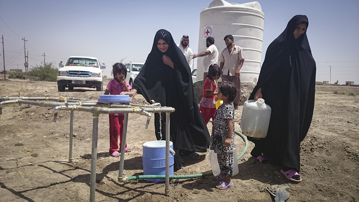 Diwaniya, sous-district d'Afak, village d'Al-Sbahee. Des personnes s'approvisionent à un point d'eau construit par le CICR. Diwaniya, Afak sub-district, Al-Sbahee village. People collecting water from a water-supply point built by the ICRC. ICRC website, article of 30.10.2014, abstracts: "Iraq: ICRC scales up activities to help over 1.5 million people As armed conflict expands in Iraq, the ICRC is stepping up its humanitarian work. It has brought food and other aid to more than 1.5 million people since January. (...) Clean water for displaced people and residents. One of the ICRC's priorities in Iraq is to make sure that people have water that is safe to drink. Since the beginning of the year, the organization has provided clean drinking water for nearly 920,000 people, more than 200,000 of whom are displaced. This has been achieved by installing new water facilities and upgrading existing ones for host communities while also delivering water by truck and installing additional storage and distribution points for displaced people. "The conflict has also had an effect on water resources," said Mr Youssef. "Because water is essential to human life, it is imperative that it be protected by parties to the conflict." Whenever possible, the ICRC has also repaired water resources destroyed as a result of fighting. (...)
