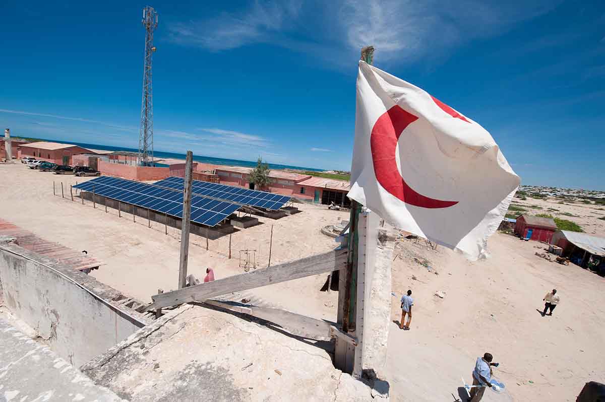The Red Cresecent symbol hoisted atop Keysaney Hospital, a health facilty run by the Somalia Red Cresecent (SRCS) in Mogadishu, Somalia. The hospital is run by the SRCS with the support of the International Committee of the Red Cross and Red Crescent (ICRC). © ICRC/Pedram Yazdi