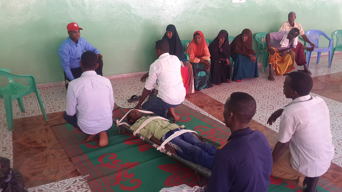 A Somali Red Crescent Society (SRCS) official gives a first aid lesson to members of the community in Galgaduud, central Somalia. The training, which took place on 29 June 2015, drew twenty people from 12 villages in Galgaduud. These participants from the community are now the first respondents in case on an emergency. ©ICRC/Bishar Osman