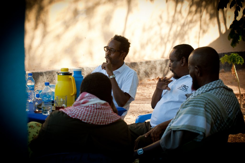 _YZD8868 International Coimmittee of Red Cross (ICRC) Field Coordinator Abdi Ismail (centre, in a white shirt with spectacles) and the head of the ICRC office in Huddur, Abdirahman Ali Adan, attentive during a meeting with community elders. Share this article