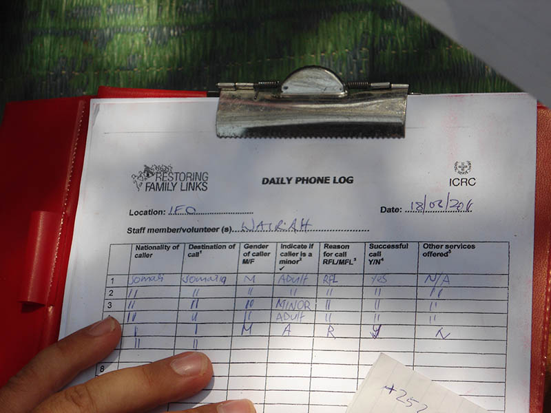 Dadaab, camp de réfugiés. Registre des appels téléphoniques. Dadaab, refugee camp. Calls register. ICRC website, Interview, 27.09.2011. Somalia/Kenya: preventing loss of family ties for refugees with a phone call In response to the recent influx of people fleeing the humanitarian crisis in Somalia, the ICRC and Kenya Red Cross Society have stepped up tracing activities in the Dadaab refugee camps in Kenya. Ivan Antonic, ICRC specialist in restoring family links (RFL), is just back from a three-week mission there to establish the first family news mobile phone service for refugees in East Africa. How does the ICRC help Somali refugees in Dadaab? One of the most urgent needs for new arrivals from Somalia is to be able to get in touch with their family members who stayed behind to let them know that they arrived safely and are well. Over the last few weeks, an average of 1,500 new refugees arrives at the camp daily. Many of them have horrific stories to tell about a rough journey and are exhausted upon arrival. Helping these people contact their loved ones is a priority for the ICRC and its restoring family links (RFL) services. RFL services in the four Dadaab refugee camps, about 70 km from the border with Somalia, began in the 1980s and give the refugees the possibility to write a Red Cross message (RCM) to their relatives in Somalia or elsewhere around the world. But you can imagine that it is very difficult to deliver written messages in some areas of Somalia right now, and it takes a long time. So the true innovation here today, is that the ICRC has decided to offer a mobile phone service for the newly arrived refugees: each of them can call a relative for two minutes anywhere in the world to let them know they are in Dadaab and doing fine. It's a very quick, efficient and cheap way of helping these people. The figures show the success of the new programme: in the past three weeks since the first phone calls were made, more than 1,800 refugees on averag