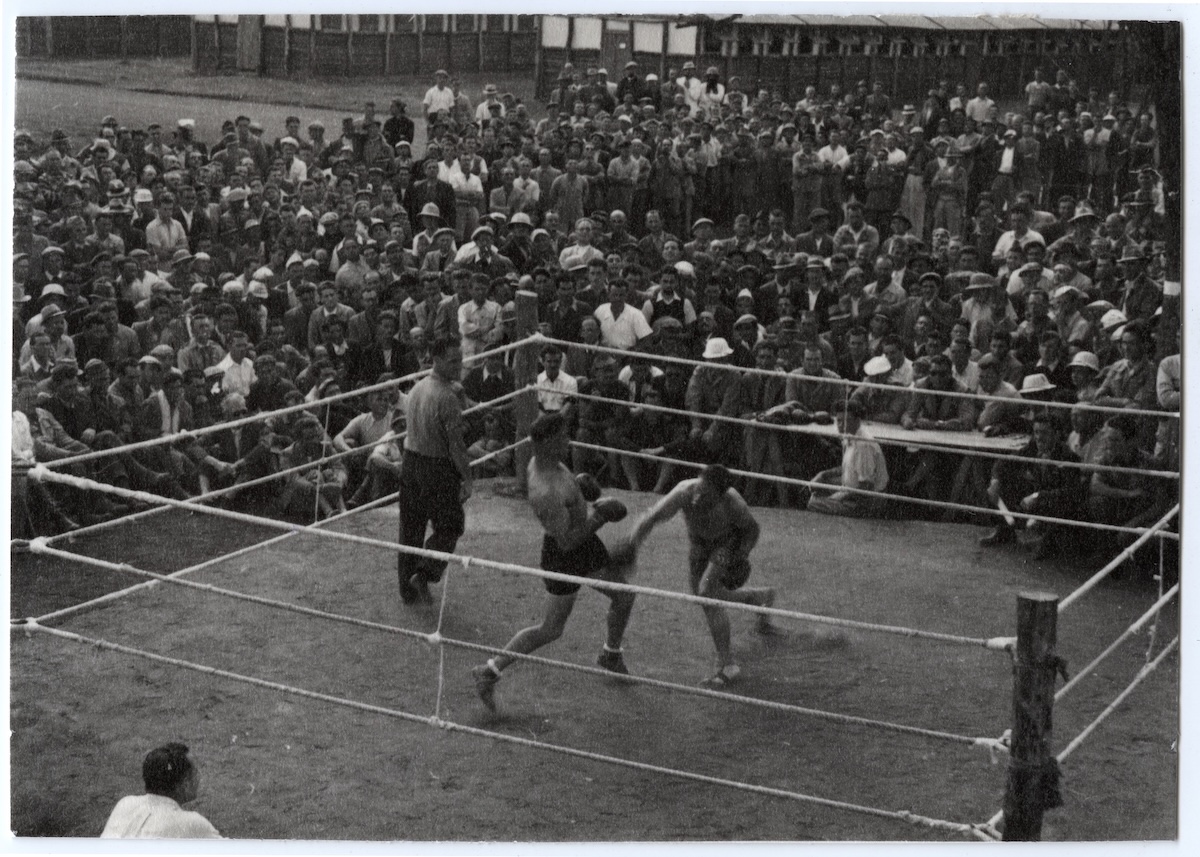 V-P-HIST-03348-32A.JPG Guerre 1939-1945. Camp d'évacuation de civils italiens. Concours de boxe. Share this article