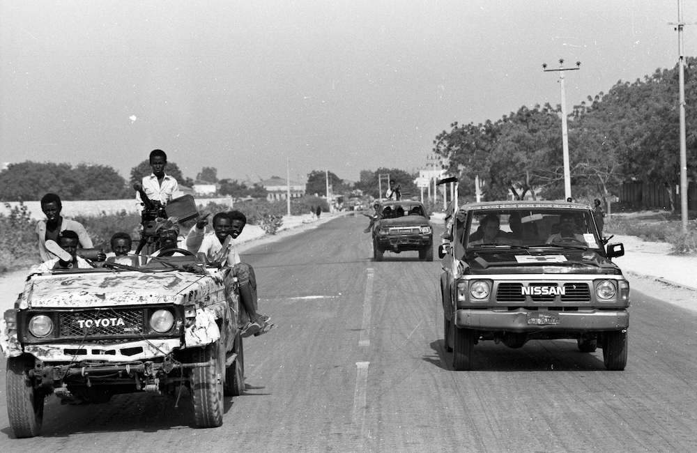 Mogadiscio. Véhicule CICR. Véhicule CICR sur une route avec d'autres véhicules transportant des combattants armés.