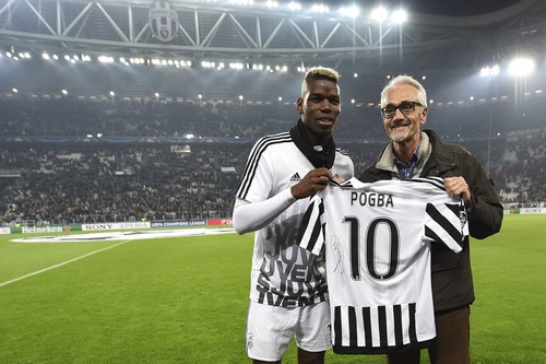 TURIN, ITALY - FEBRUARY 23: Paul Pogba (L) of Juventus gives his jersey to Alberto Cairo, Head of the Inter Committee of the Red Cross rehabilitation center in Kabul, prior to the UEFA Champions League Round of 16 first leg match between Juventus and FC Bayern Muenchen at Juventus Arena on February 23, 2016 in Turin, Italy. (Photo by Valerio Pennicino - UEFA/UEFA via Getty Images)