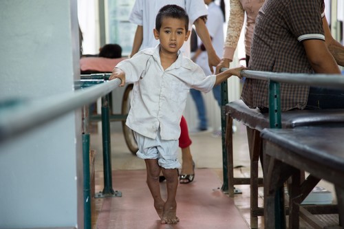 Cambodia-50029 Determined young Polio patient pushing his way to the end of the walkway in the Battambang Regional Physical Rehabilitation Centre,Cambodia. Share this article