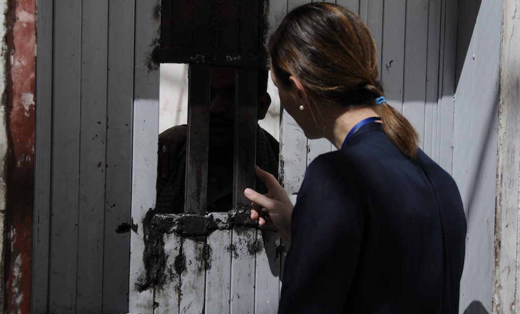 Sanaa, prison centrale. Une employée du CICR parle à un détenu à travers les barreaux de sa cellule, lui expliquant les motifs de sa visite, afin de savoir s'il veut s'entretenir avec elle. Sana'a, Central Prison. An ICRC employee is speaking to a detainee behind bars, explaining the purpose of the ICRC visits and inquiring whether he would like to talk to her.